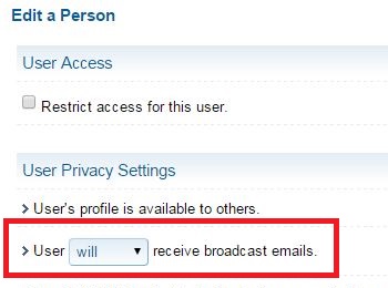 - Under User Privacy Settings check whether this member is marked as "will receive broadcast emails". If the member is marked as "will NOT receive broadcast emails", then this person may have unsubscribed from eblasts at some point.