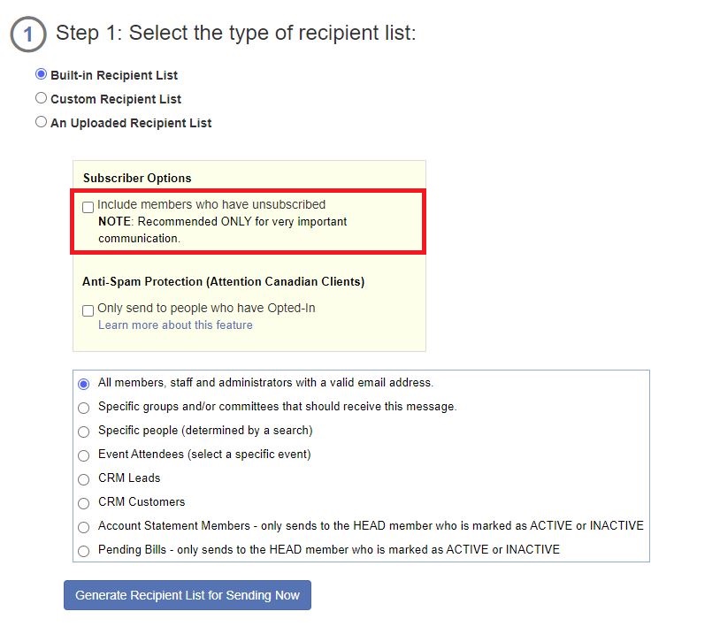You may send important club correspondence using the Include members who have unsubscribed option when selecting the type of recipient list.
