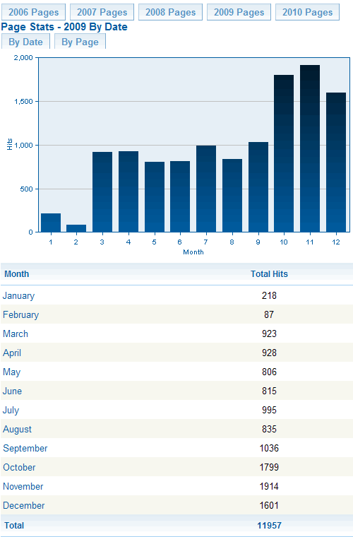 The first section of Statistics, "Web Page Stats", contains a selection of graphs to display your hits by date and by page. Choose a year to begin. A histogram will appear displaying the hits per month for that year: