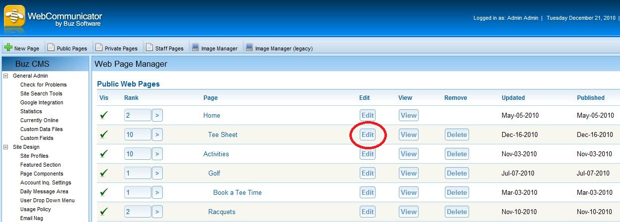 To edit a page click on a page, from the Page Manager, click on the page name or the Edit button.