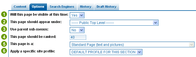 You will be in edit mode with five tabs across the top of the page: Content, Options, Search Engines, History and Draft History.