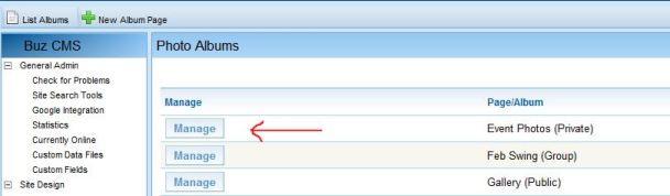 Once you have created a Photo Album page, the name of that page will represent the name of the album in the Photos section. When viewing the list of available albums, click on the 'Manage Button' in order to edit the album or add pictures to the album: