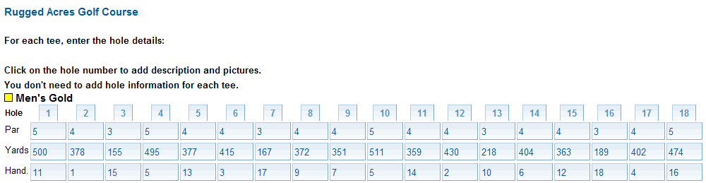 After creating tees, move to the Holes section. Here you will find fields in which to enter hole information like yards and par. If you like you can even add pictures, a description and a pro tip by clicking on the hole number. The list will look like this: