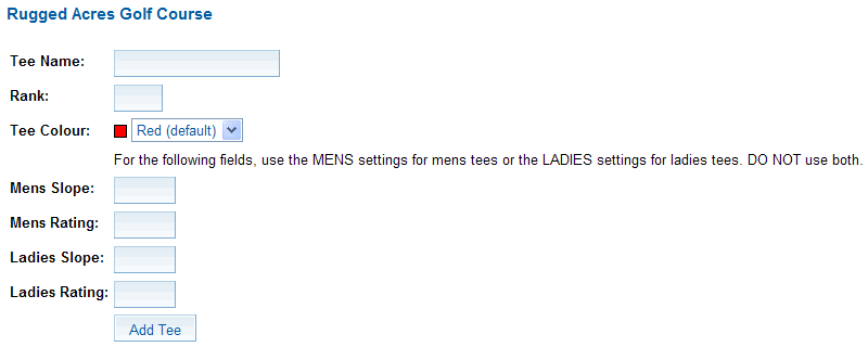 The fields in creating a Tee are pretty straightforward, just remember for the men's slope and rating and the lady's slope and rating to only fill the settings for one gender. Press "Add Tee" to complete the process.