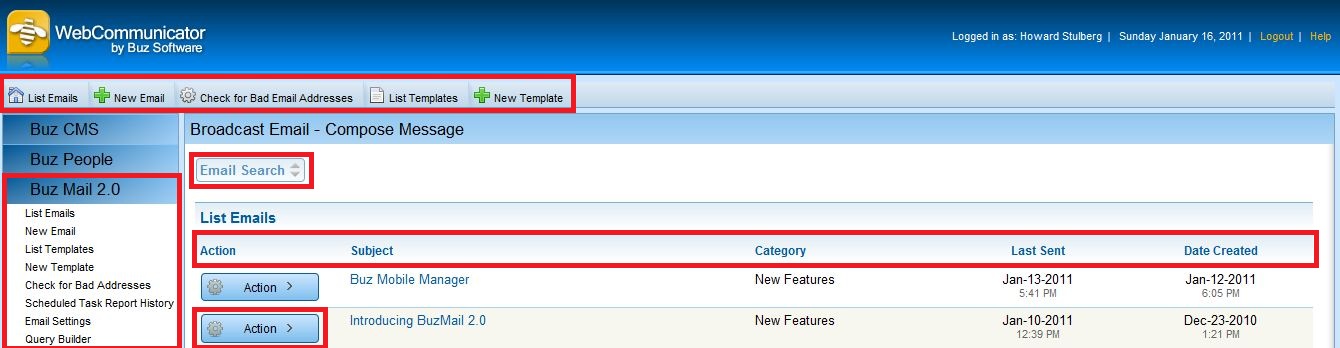 To launch the List Emails page login to Admin Home and select List Emails from the section Buz Mail 2.0 on the Outlook Bar.